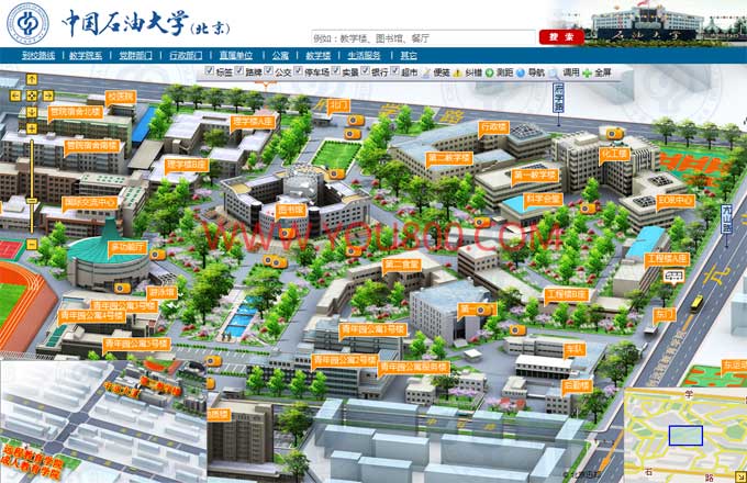 提供師生日常工作學習所必須的校園生活服務設施信息查詢,可以對校園內的食堂餐廳、購物超市、校內醫療、郵寄快遞、浴室、圈存機、打字復印、銀行網點、通信營業廳、充電樁及其他生活設施在三維地圖進行分層標注、查詢、定位管理。