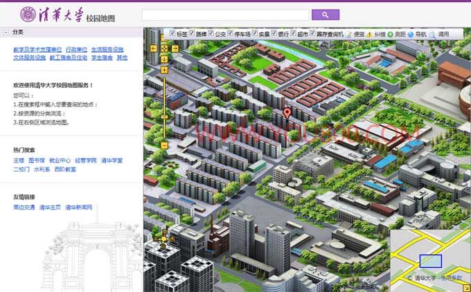 校園地圖系統可將校內的所有機構設置進行導航定位,并提供地圖信息查詢包括機關部處、直屬單位、學院(系),提供單位詳情、電話、導航、本樓其他單位、網站鏈接、樓宇平面圖、全景瀏覽等。